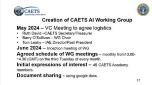 Barry O’Sullivan FIAE provided an overview of the AI working group’s activities, highlighting energy consumption concerns, misconceptions about artificial general intelligence, and historical connections to key figures in AI development. The presentation ended with updates on a collaborative project to prepare a white paper focused on AI and engineering, including discussions on economic impacts and the upcoming release of a white paper in Q4 2025 with recommendations for AI implementation.