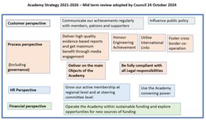 Tom Leahy, Immediate past President & Special Advisor,  reported on the review of the Academy 5-year strategy (2021-2025) adopted by IAE Council on 24th  October 2024. This uses the “Balanced Scorecard” an Internationally recognised Business management tool from the Harvard Business School.