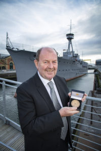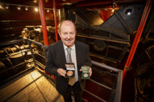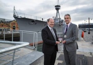 We chose World War one veteran vessel, HMS Caroline as our venue for the ceremony, as she was powered by four Parsons steam turbines – invented by Sir Charles Algernon Parsons, eminent Irish engineer, and namesake of the medal. Sir Charles Parsons’ descendant, the 7th Earl of Rosse, Sir Brendan Parsons presented the medal to Sir John, along with a commemorative €20 coin celebrating Sir Charles, which was minted in 2017 by the central bank.